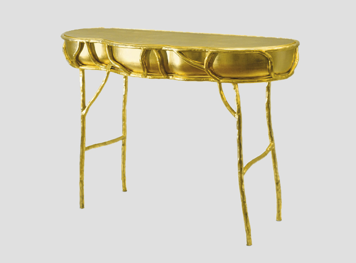 Console Elizabeth Garouste au piètement en fer battu recouvert de feuille d’or jaune. Plateau en bois sculpté recouvert de feuille d’or. Edition limitée à 8 exemplaires + 4 épreuves d’artistes.