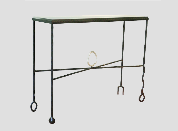 Piètement en fer battu à la main réalisé par Pierre Basse, Plateau en travertin martelé sur la tranche.
