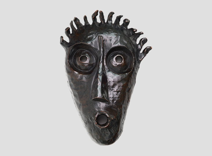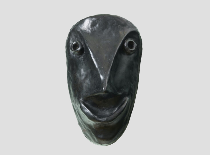 Création 2026, masque en bronze noir en forme de visage souriant, style art africain. Autres patines: or, vert, brun, blanc.
