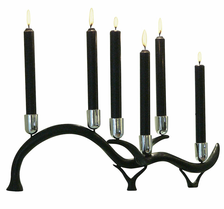Chandelier en bronze patiné noir. Versions : 6 et 7 bobèches, en bronze poli or ou passé au bain d’argent. Chaque version est limitée 30 exemplaires numérotés. Créé pour l’exposition « Fragmentations ».