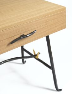 Chevet Table chevet Asturias, fer battu, feuille d’or, plateau de chène avec tiroir. Piètement et poignée réalisés par Pierre Basse, ferronnier de Diego Giacometti, qui travaille en exclusivité pour la galerie. Dimensions et finitions sur mesure .