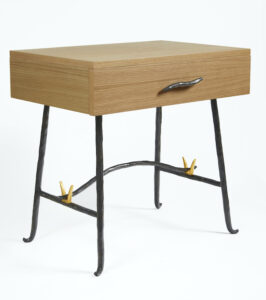 Chevet Table chevet Asturias, fer battu, feuille d’or, plateau de chène avec tiroir. Piètement et poignée réalisés par Pierre Basse, ferronnier de Diego Giacometti, qui travaille en exclusivité pour la galerie. Dimensions et finitions sur mesure .