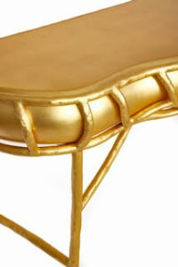 Console with a structure in hand wrought iron gilded with yellow gold leaf. Sculptured wooden top also gilded with gold leaf. Limited edition of 8 numbered examples + 4 artist proofs. Alternative finish: white gold leaf. Produced by the ironsmith of Diego Giacometti, Pierre Basse, who works exclusively for the gallery.