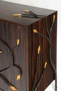 Spectacular sideboard in oak, surrounded by a framework of hand-wrought and sculpted iron by Pierre Basse, the ironsmith of Diego Giacometti, who works exclusively for the gallery. The ornamental leaves are gilded in gold leaf. Dimensions, choice of wood and finishes on request.