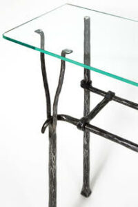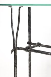 Console with a structure in hand-wrought patinated iron. Glass top. Other patinas: black, gold,”canon de fusil”, or gilded with gold leaf (white, yellow, or pink). Choice of top, patina, and dimensions on request. Produced by the ironsmith of Diego Giacometti, Pierre Basse, who works exclusively for the gallery.